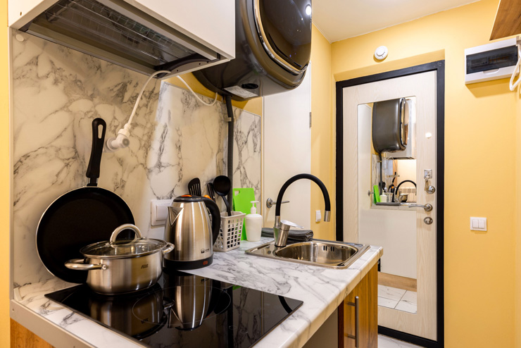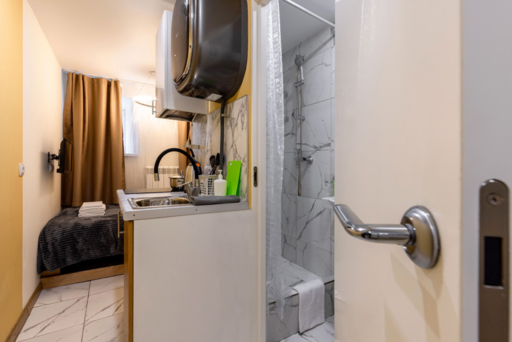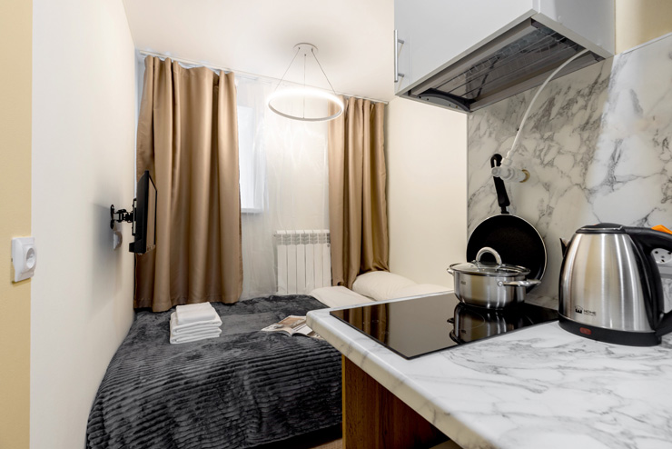 - Оборудование: микроволновая печь, мини-холодильник, набор посуды, плита электрическая, стиральная машина, телевизор, электрочайник