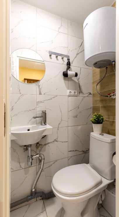 - Оборудование: мини-холодильник, обогреватель, плита электрическая, стиральная машина, телевизор, утюг, электрочайник